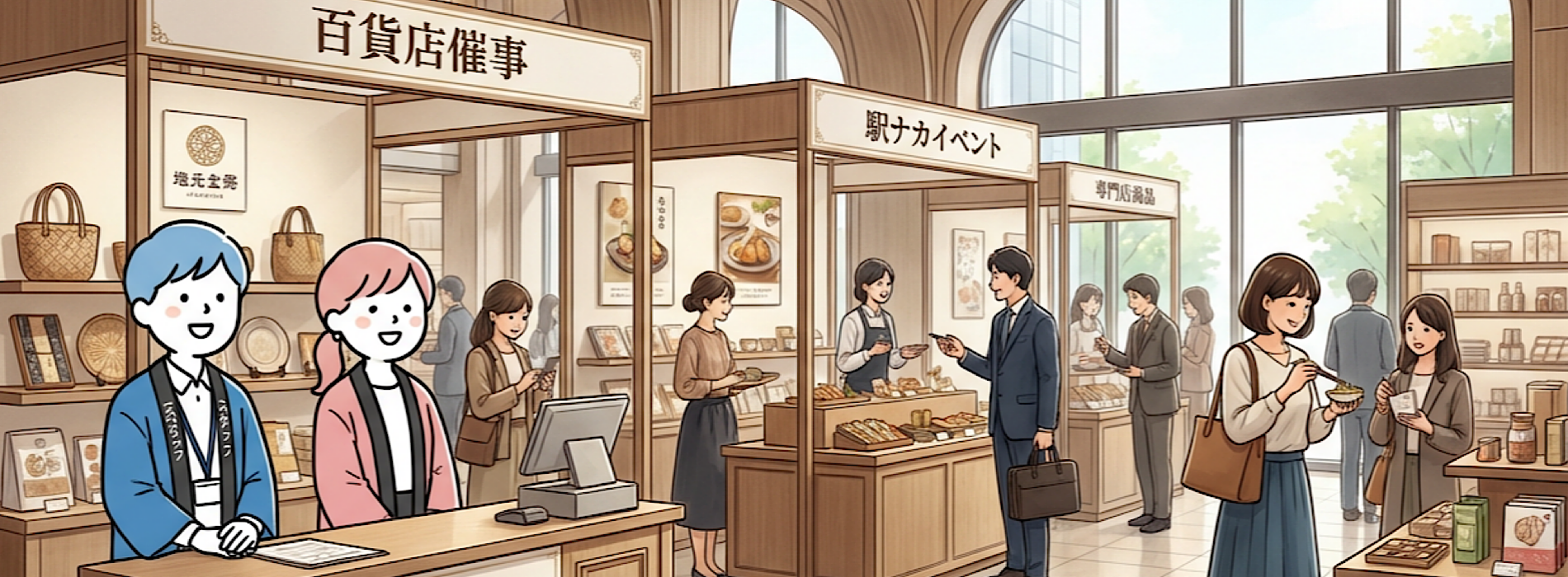研修を受けた販売スタッフと、百貨店実務に精通したマネージャーが現場を統括します。催事ごとに異なる店舗のルールや運営フローを理解したうえで、 設営から販売、撤収までの実務を現場で丁寧に進めます。日々の売場対応や進行管理も含め、 催事運営に必要な実務を安定して遂行できる体制を整えています。